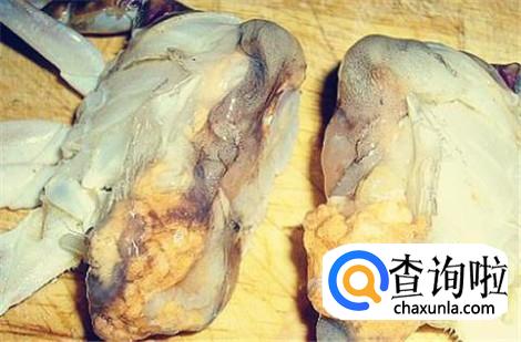 把梭子蟹翻过来,看一看梭子蟹背后的那个三角形了么?这个是不能留的,先将这个三角形的东西去掉再切。