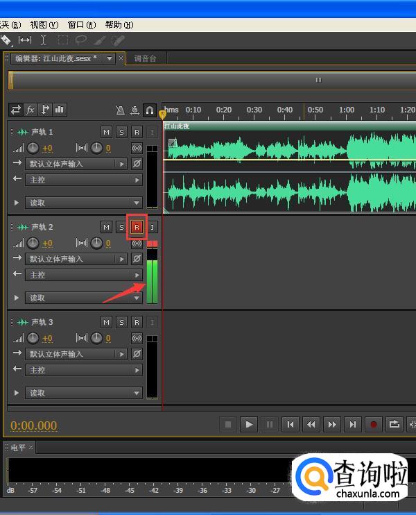 接着我们在第二条音轨(音轨2)里,点击左边那个R,当R变成红色,就自动变成了录音准备状态,旁边有一条绿色的上下波动的音频标识,表示录音一切处于正常中,这个R为录制的意思,你可以看到每个音轨都有R,意思就是你想录音,可以点击任意一条空白的音轨,除了有伴奏的那条音轨,音轨2音轨3、音轨4等等都是可以录制人声的。
