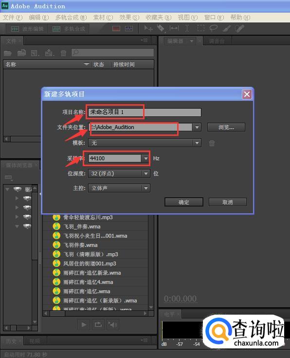 在新建的音轨文件界面,修改一下如下信息:项目名称、文件夹位置、采样率。其中采样率未44100-48000之间。