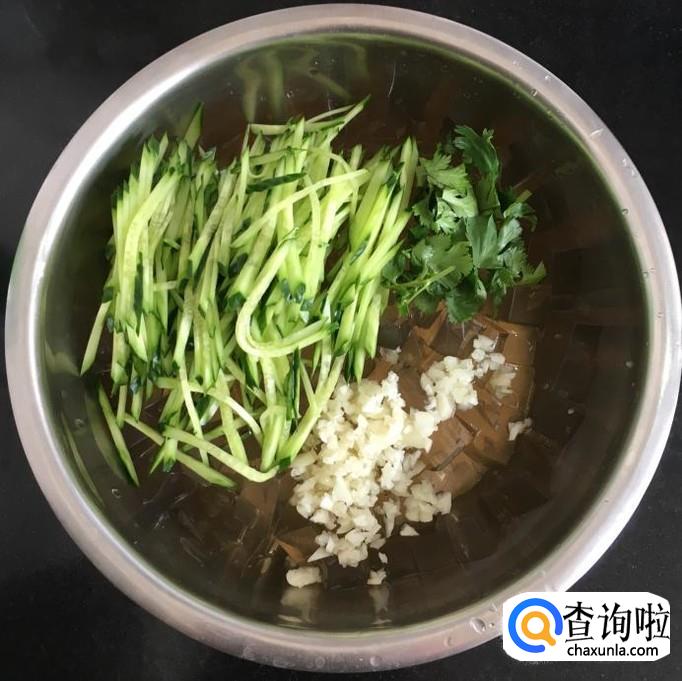 把切好的凉粉块、黄瓜丝、蒜末、香菜段放入一个容器中备好