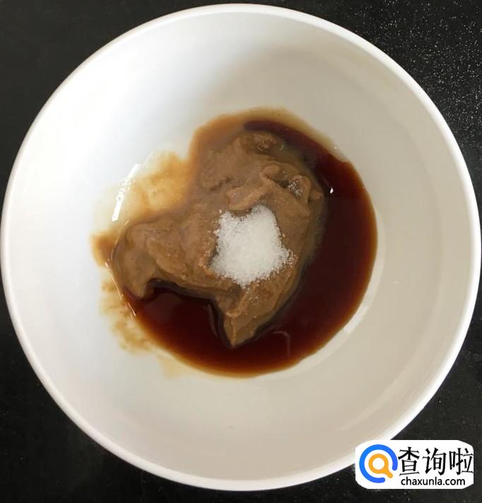 取适量的芝麻酱放入碗中,加入适量的盐、味极鲜酱油、水和一点点白糖搅拌均匀使其稀释