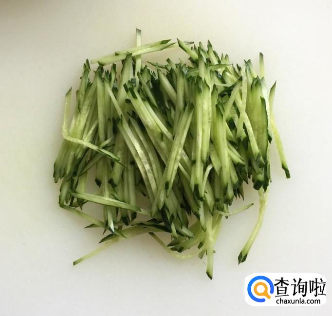 黄瓜一根清洗干净后切成粗细均匀的黄瓜丝备好