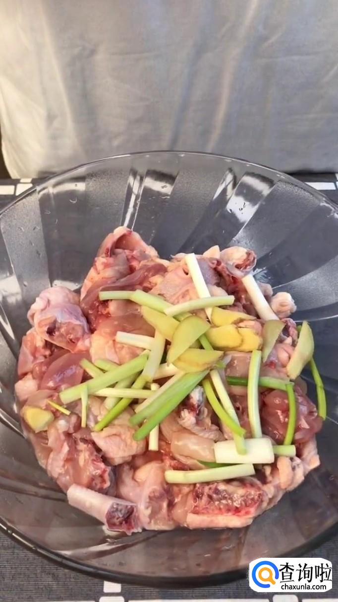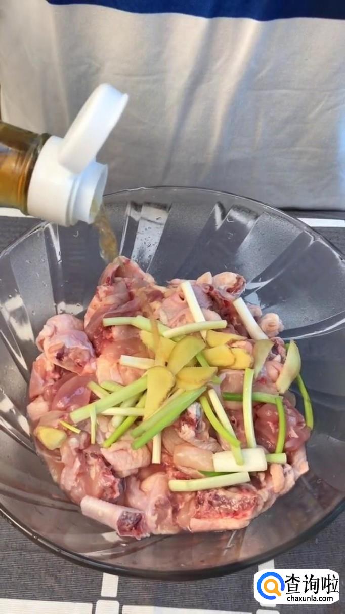 接着把鸡肉放到容器当中,并加入适量的生姜和葱段且滴入几滴香油,如下图所示。