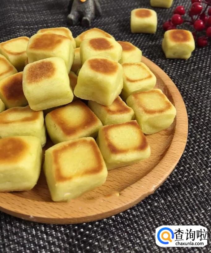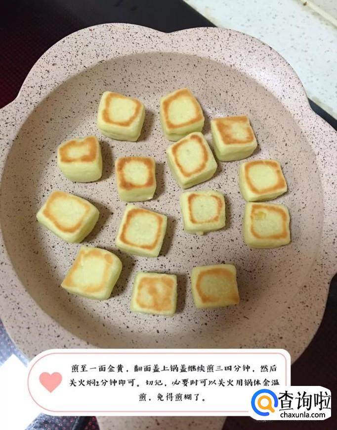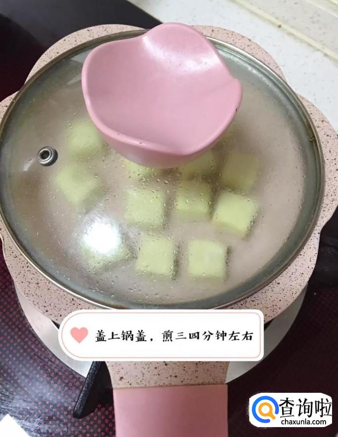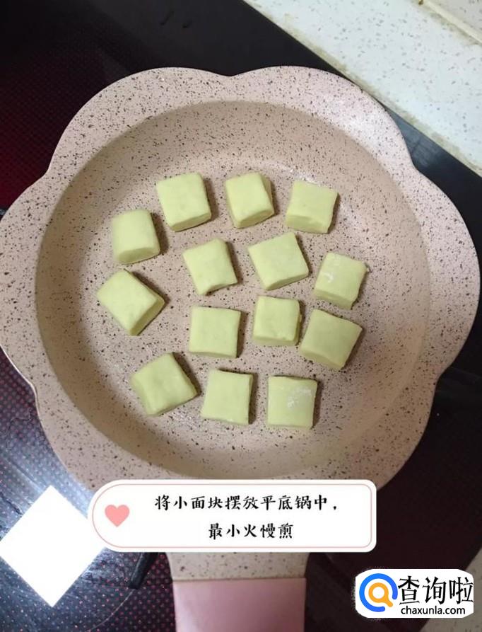 然后往锅中放入适量的食用油,待油冒烟,放入小方块开小火慢慢煎,如下图所示。