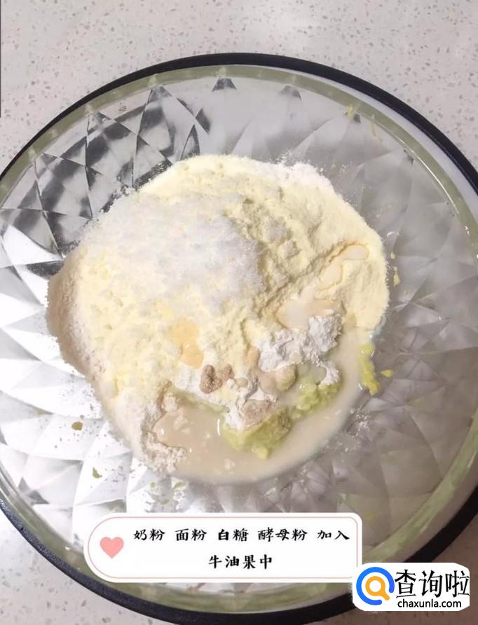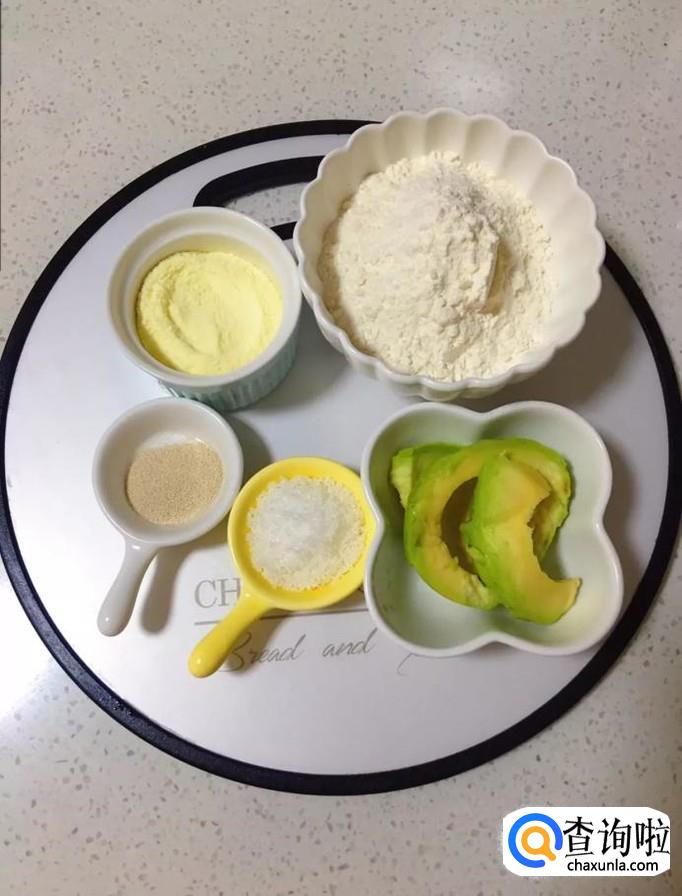 首先准备好所有要用到的食材,如下图所示。小贴士:牛油果一个,面粉150克,奶粉30克,酵母3克,白糖20克。
