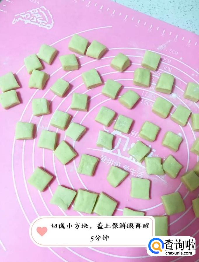 接着切成方块,盖上保鲜膜继续醒发五分钟,如下图所示。