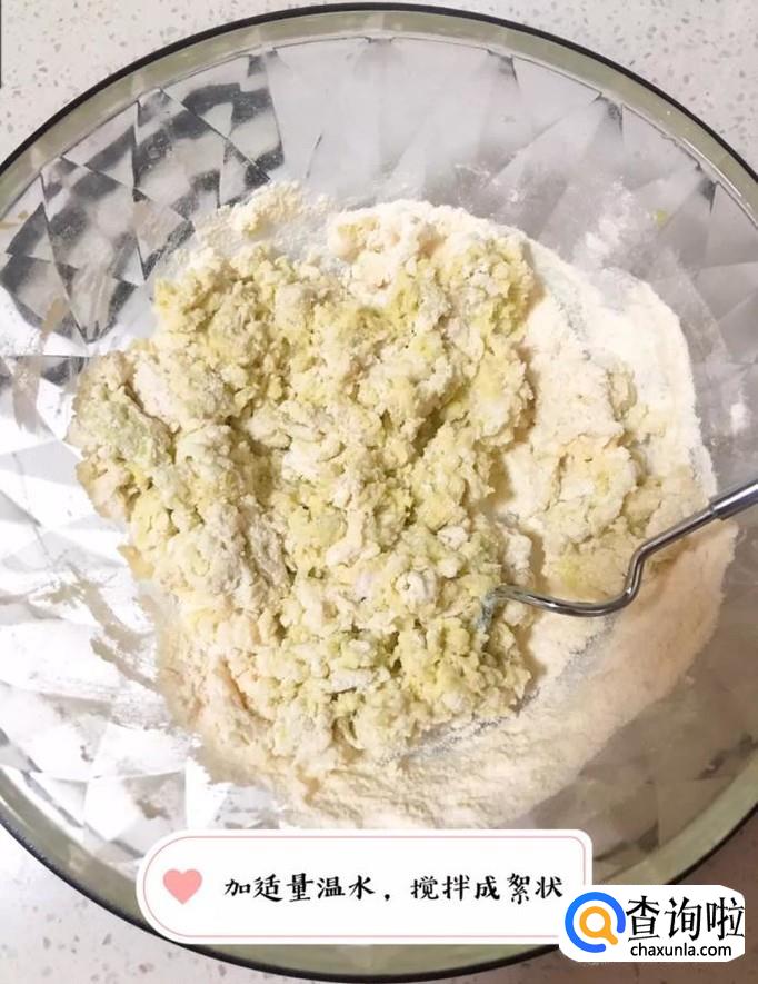 然后加入适量的温水,搅拌成棉絮状,如下图所示。