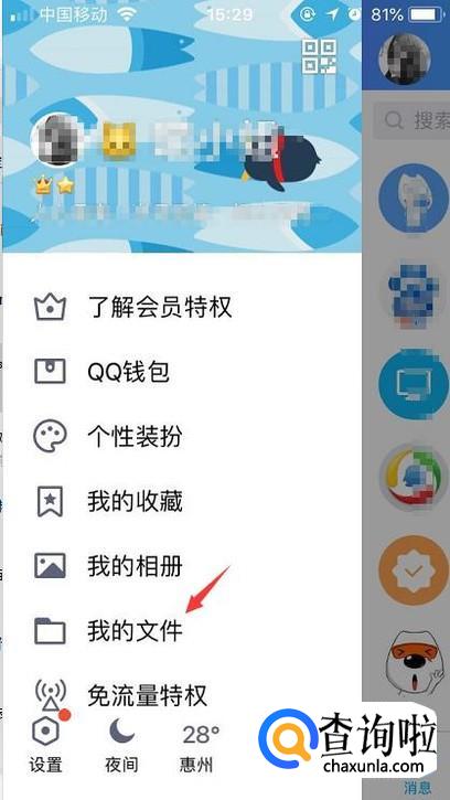 首先我们登录qq后点击左上角的头像会看见一个我的文件入口。