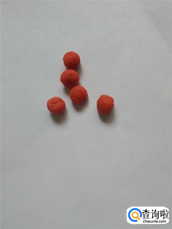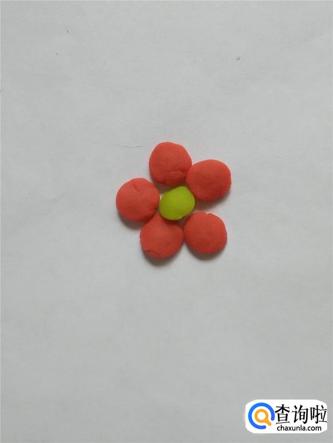 再用红色团五个相同大小的圆球,再按成五个扁片,围在黄色花芯周围,当作花瓣。