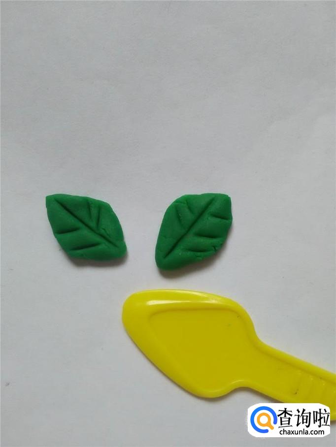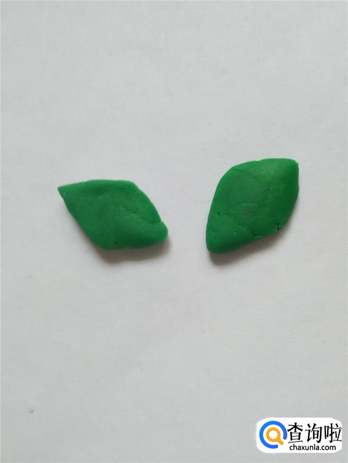 再用两块绿色捏成两片叶子,两端尖尖的,中间宽宽的。