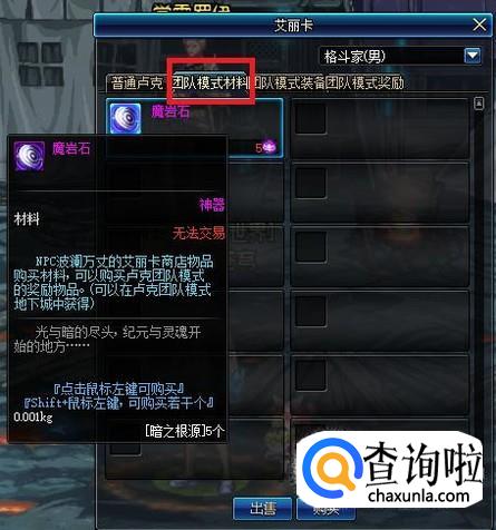 材料“魔岩石”可以在卢克团队模式地下城中获得,也可在艾丽卡商店的“团队模式材料”一栏中,消耗五个“暗之根源”进行购买。