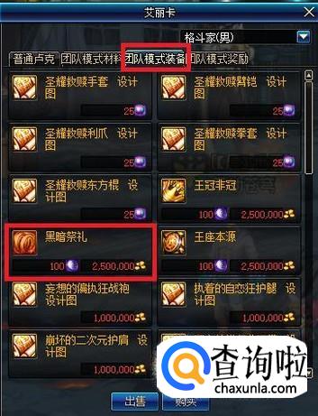 在艾丽卡商店的“团队模式装备”一栏中,消耗100个材料“魔岩石”以及250W金币,即可成功购买“黑暗祭礼”。