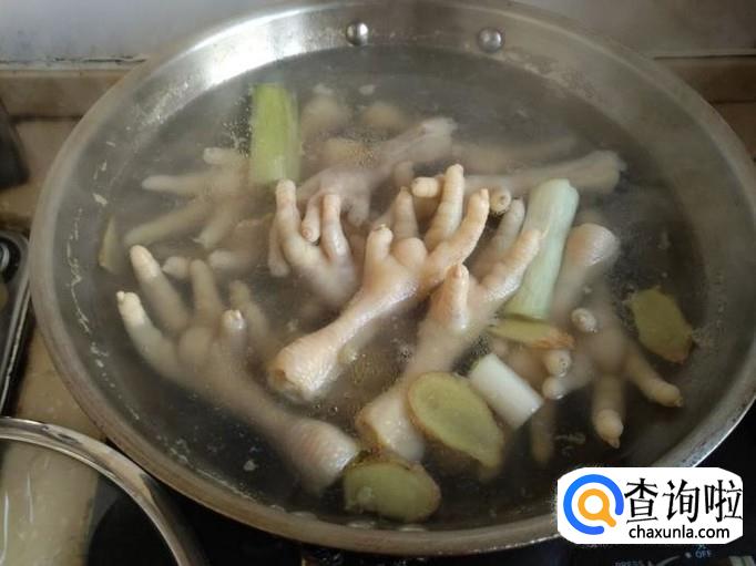 然后将鸡爪放入水中,加入葱姜蒜,料酒,花椒,大料,煮十五分钟