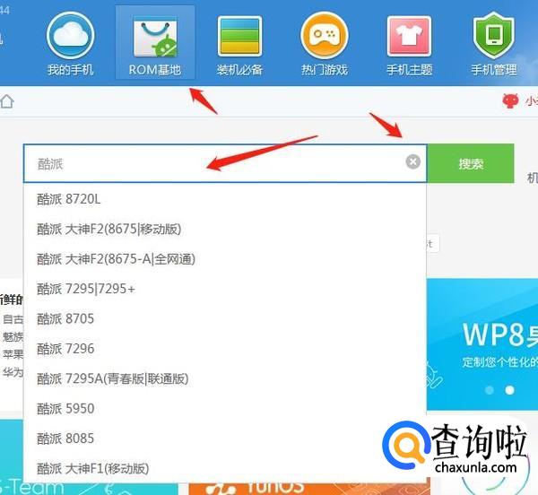 连接成功后,我们点击顶部导航的“rom基地”利用搜索框快速查找我们的手机rom包。