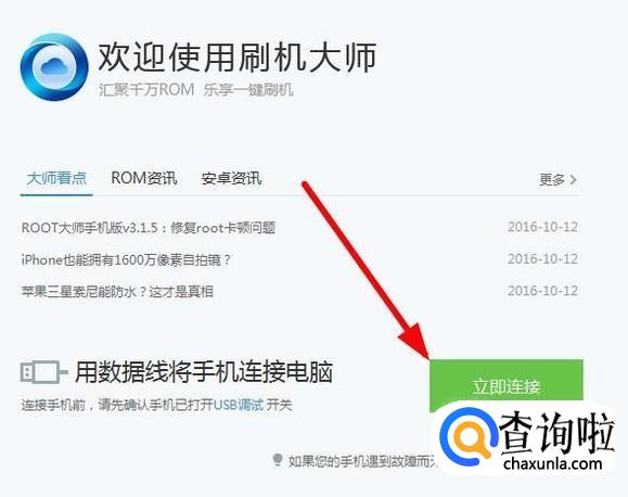 安装成功后,我们运行刷机大师,在刷机之前我们需要用usb线将手机连接至电脑。