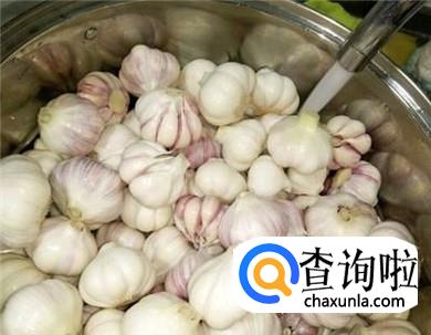 将新鲜的大蒜揭去最外面的皮,只留里面两层干净的内皮,放入盆中,用清水洗净。