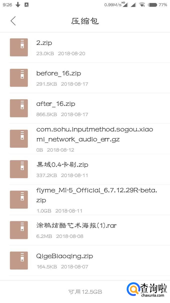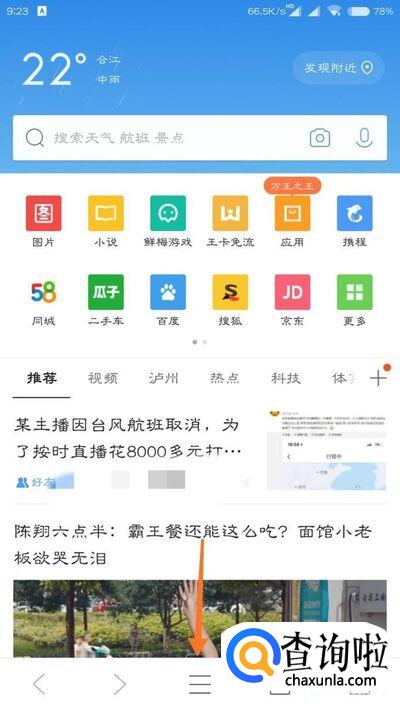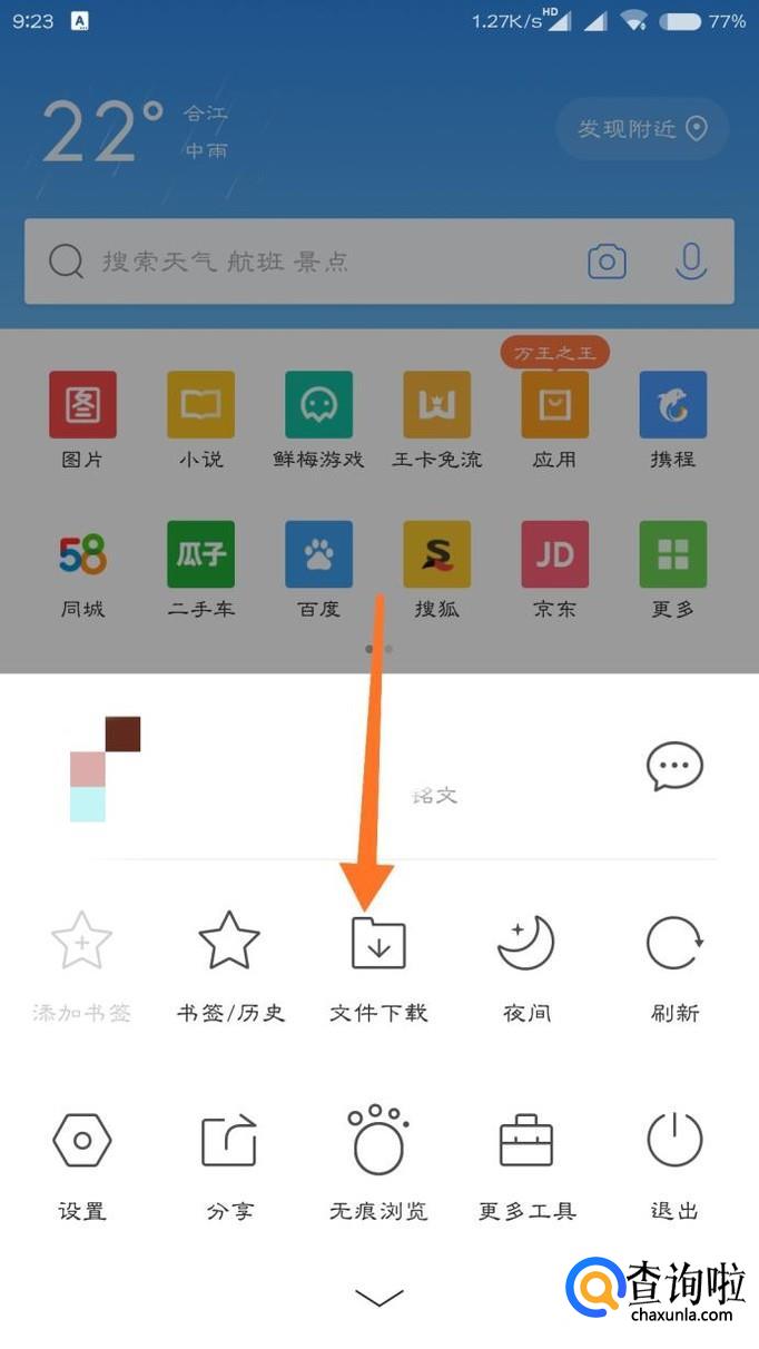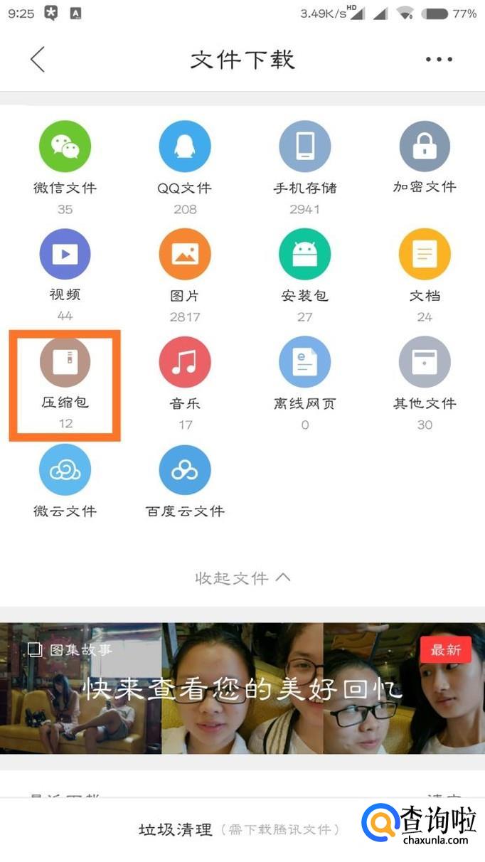 在屏幕最下方是在QQ浏览器下载的文件信息,点击上方的“压缩包”。