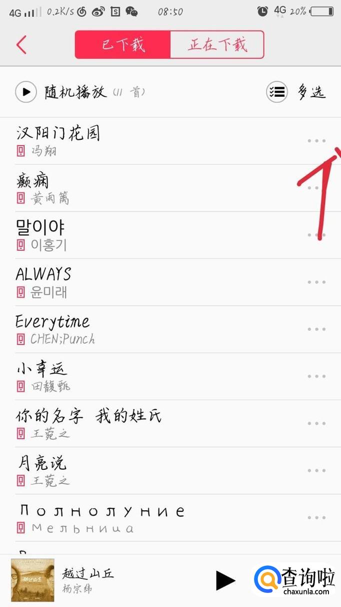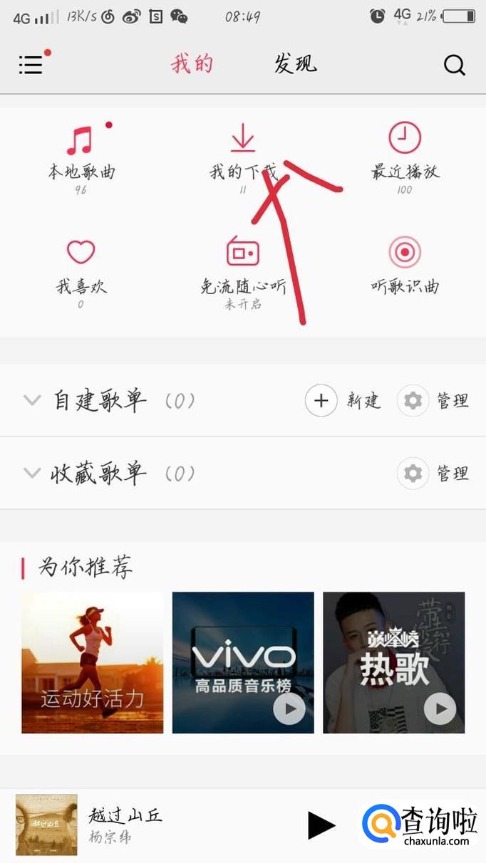 点击最上方从左往右数第一个我的按钮,在我的下载里面找到自己刚刚下载的音乐,如图1箭头所示。会出现一个新的界面。如图2所示。点击歌后面的3个点点的按钮,如图3箭头所示。选择设置为铃声。