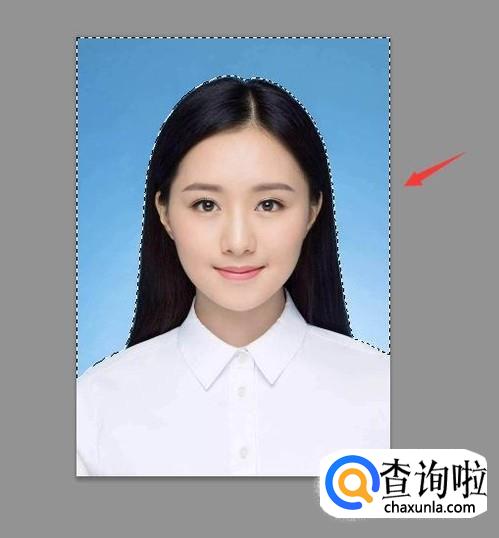 选择魔术棒工具我们在照片蓝色背景上点击就得到了背景的选区,如图所示: