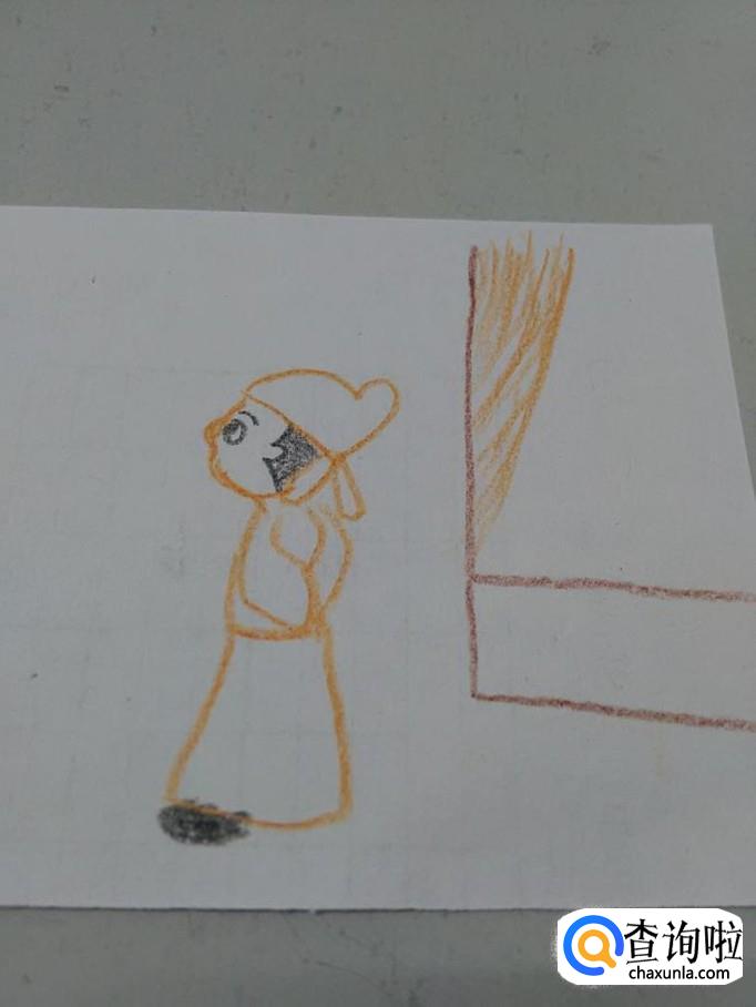 在人物的左上角,用绿色画一个半圆,表示圆形的窗户。