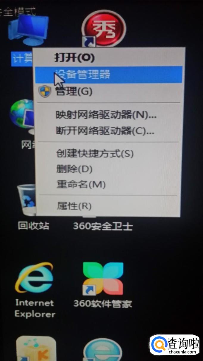 在安全模式的桌面右键单击“计算机”,在弹出的菜单里点击“设备管理器”。