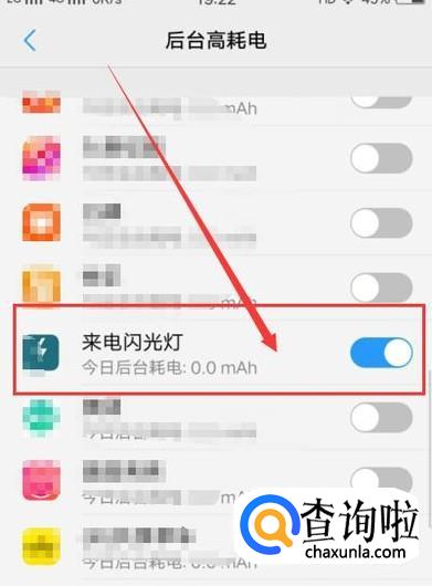 进入之后,点击“后台高耗电”,然后将“来电闪光灯”打开,如图所示。