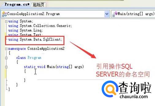在Program.cs界面中引入SqlClient命名空间,这个空间里包含了所有的操作SQL SERVER的功能,如下图所示