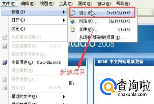 打开Visual Studio 2008工具,点击文件菜单,选择新建下面的项目选项,如下图所示