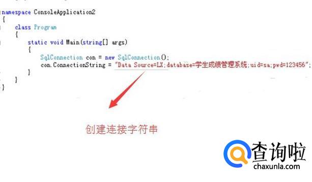 接下来我们实例化SqlConnection,然后通过SqlConnection实例创建一个连接字符串,如下图所示