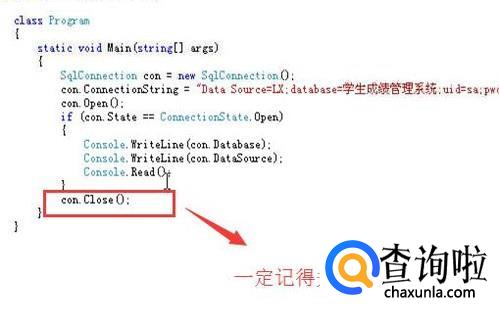 最后要提醒的是,在操作完SQL SERVER的时候,一定要通过Close方法将数据库关闭,如下图所示