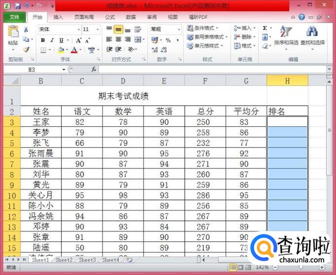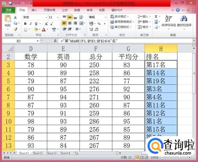 注意:F3是我们总分列的第一个数据,排名的范围在F3:F24,“第几名”其实就是在我们一般的排名函数前后各加了一个字。
