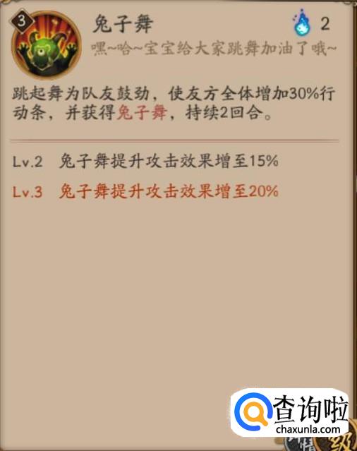 山兔是一个必练的式神,在大佬的阵容中山兔和镰鼬搭配将是一个非常恐怖的存在,山兔的三技能兔子舞能给全体成员增加30%的行动条和10%的攻击,仅消耗两鬼火。