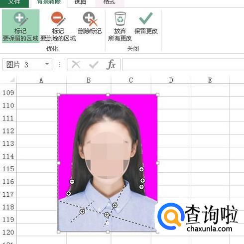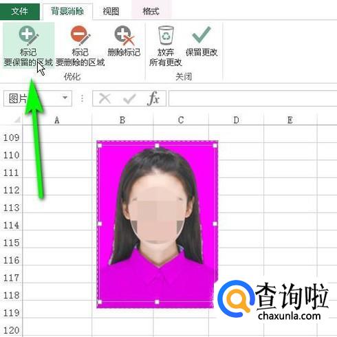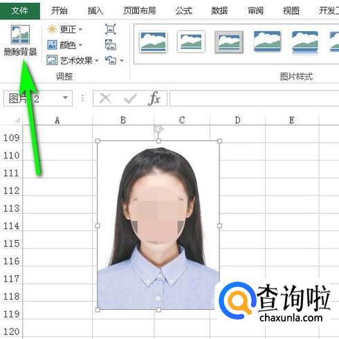 图片即插入到工作表中。接下来我们要把照片白色背景删除掉。选中照片,再点开“格式”选项卡,在下面展开相关的功能组,鼠标再点击左侧的:删除背景