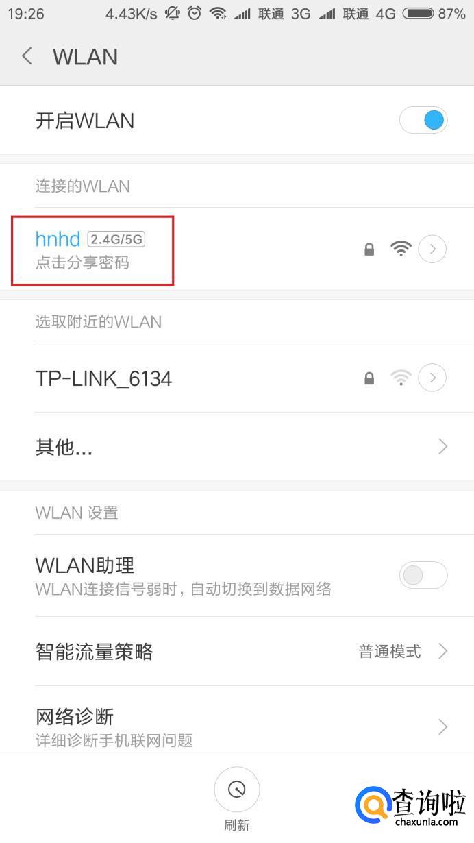 查看当前已经连接成功的无线网络,选择“点击分享密码”选项。