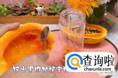 然后将果肉挖出放入榨汁机,再放适量蜂蜜,榨成糊糊。