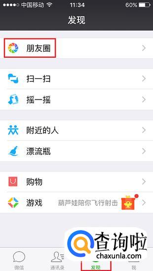 打开微信点开【发现】,选择到上方的【朋友圈】。