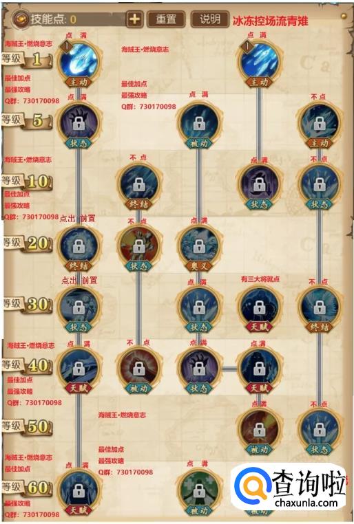 下面几张图就是青雉的技能加点推荐了,注意,这是个土豪加点法——70级并吃了所有技能书。