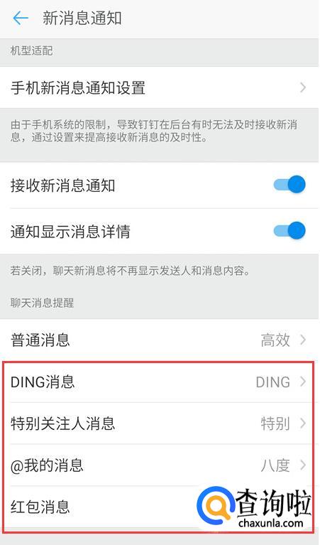 其他的DING消息,特别关注人的消息,@的消息,红包消息等都可以依次点进去设置声音和振动。