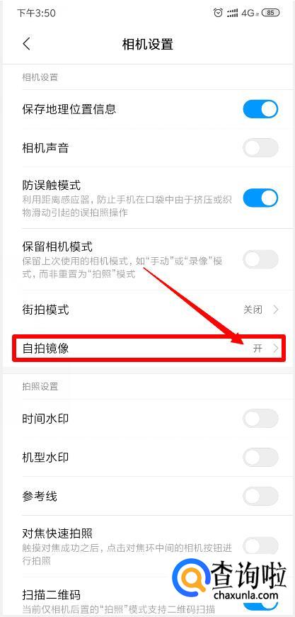 进入设置页面,找到自拍镜像,选择打开即可。