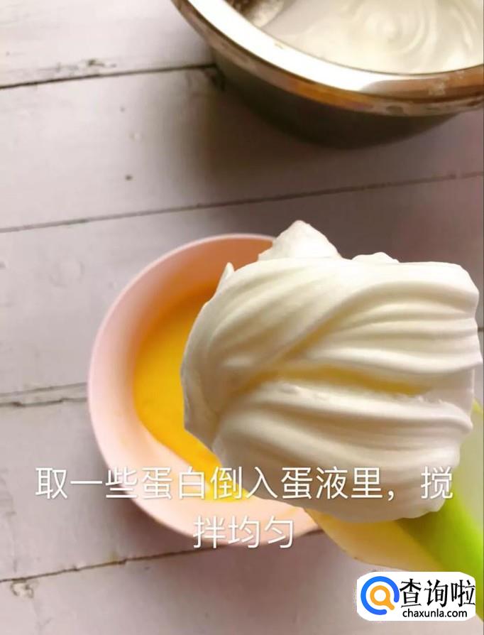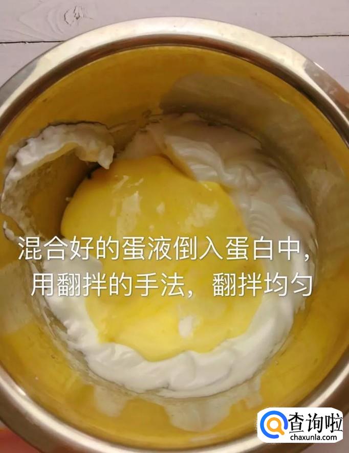 然后将剩余的蛋液倒入蛋白中用翻拌的手法翻拌均匀,如图所示。