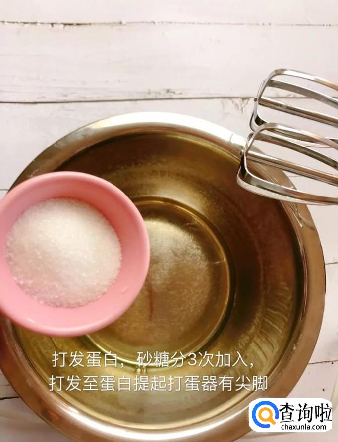 然后将砂糖分三次加入蛋清中,打发至有尖角,如下图所示。