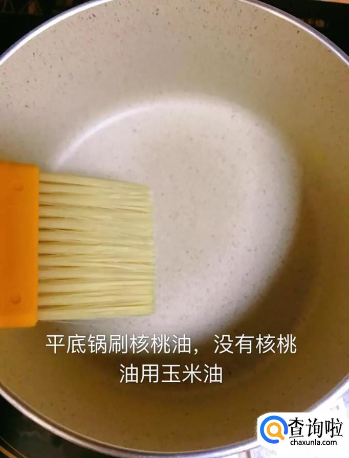 然后在平底锅上刷上一层核桃油,如图所示。小贴士:如果家里没有核桃油,可以用玉米油替代。
