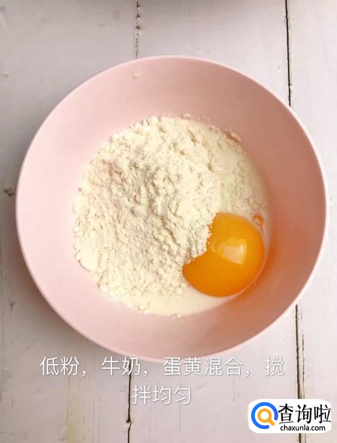 接着将低粉、牛奶和蛋黄混合搅拌均匀,如下图所示。