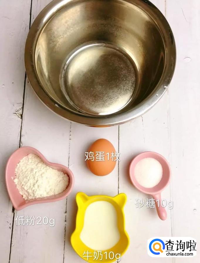 首先准备好所有要用到的食材,如下图所示。小贴士:鸡蛋一枚,低粉20克,牛奶十克,砂糖十克。