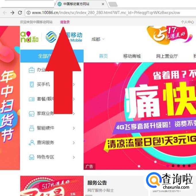 我们首先进入中国移动的官网,登录自己的手机账号。
