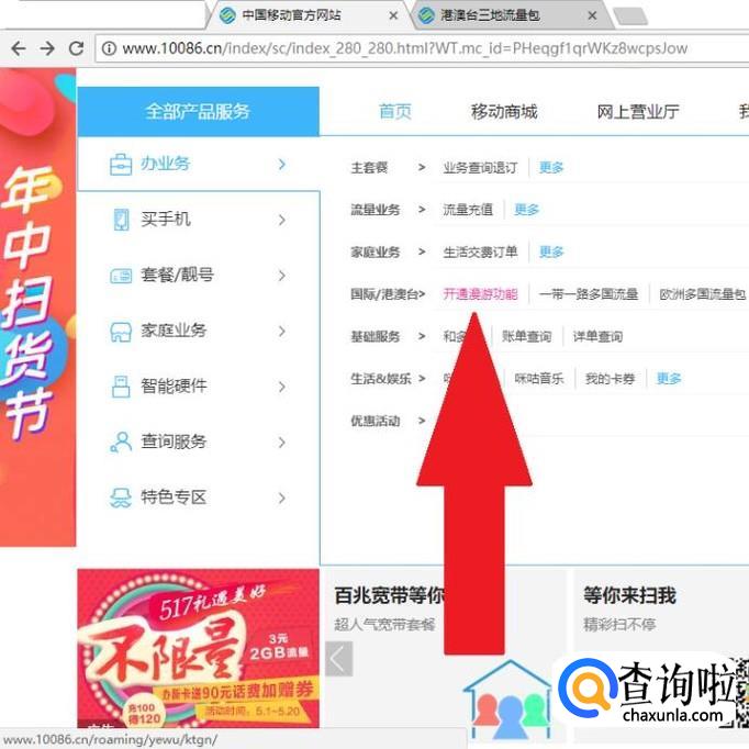 然后点击进入“办业务”下面的“开通漫游功能”页面。