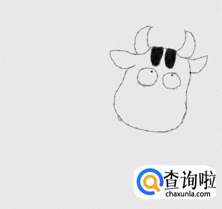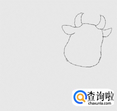在奶牛两只角的基础上画出奶牛的两只耳朵和头部,如图所示: