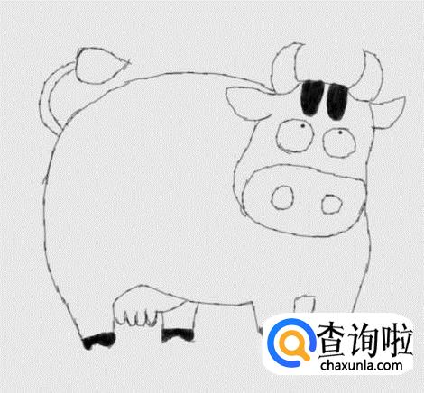再在奶牛身上画出奶牛的尾巴,然后再在后腿处画出奶牛的奶子,如图所示: