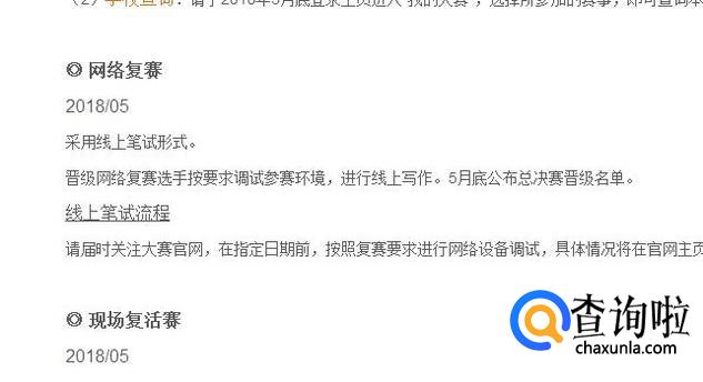 这个比赛的初赛和复赛全部都是在网上进行的,初赛通过后,可以进入复赛,还有复活赛,把握好机会就可以了。