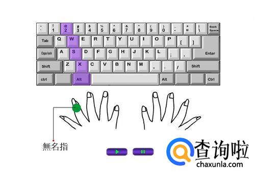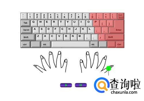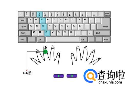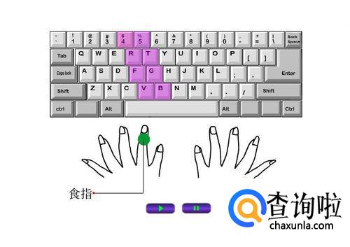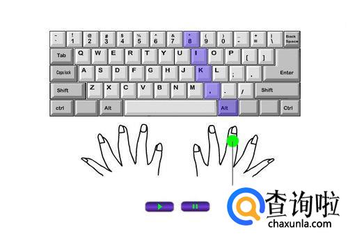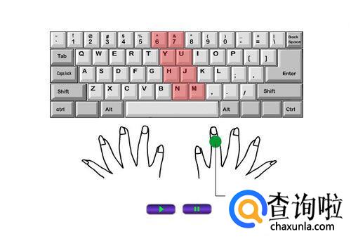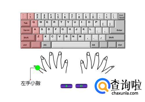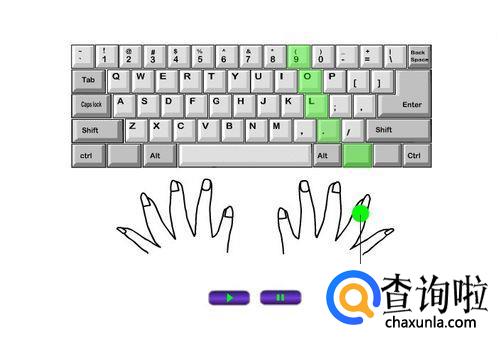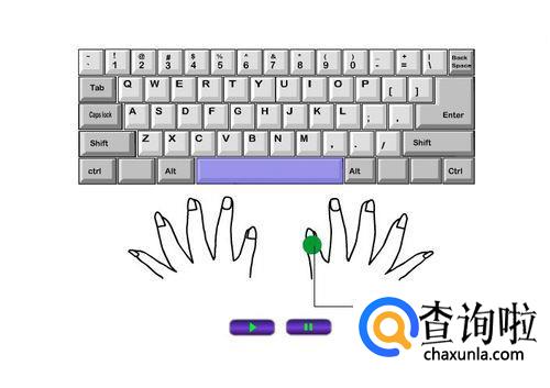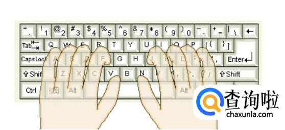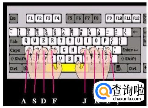 两个大拇指控制空格键,左手另四指分别放在A、S、D、F四键上,右手另四指分别放在J、K、L、四个键上,左手食指放在F键,右手食指放在J键。这两个键上都有上小凸起,不用眼看,用手指一摸就找得到了。